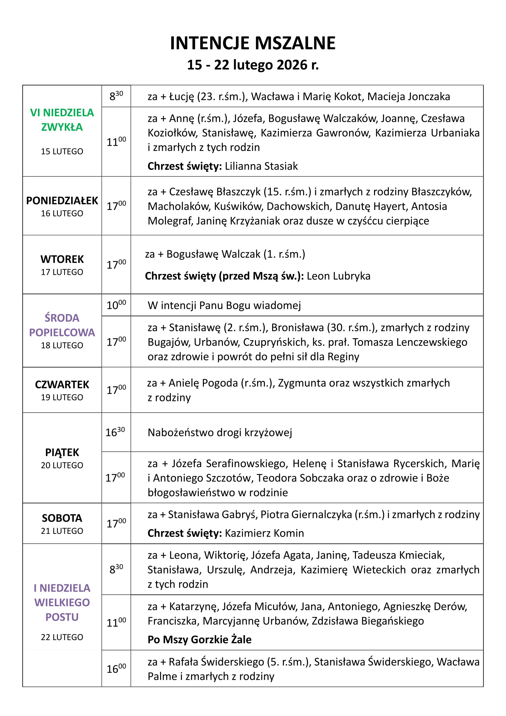 Intencje mszalne: 15 – 22 lutego 2026 r.