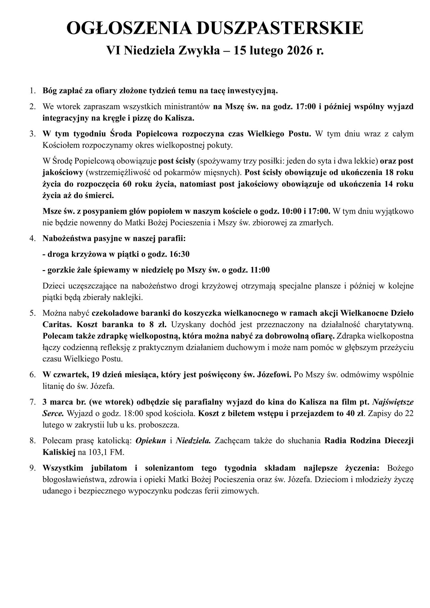 Ogłoszenia parafialne: 15 – 22 lutego 2026 r.