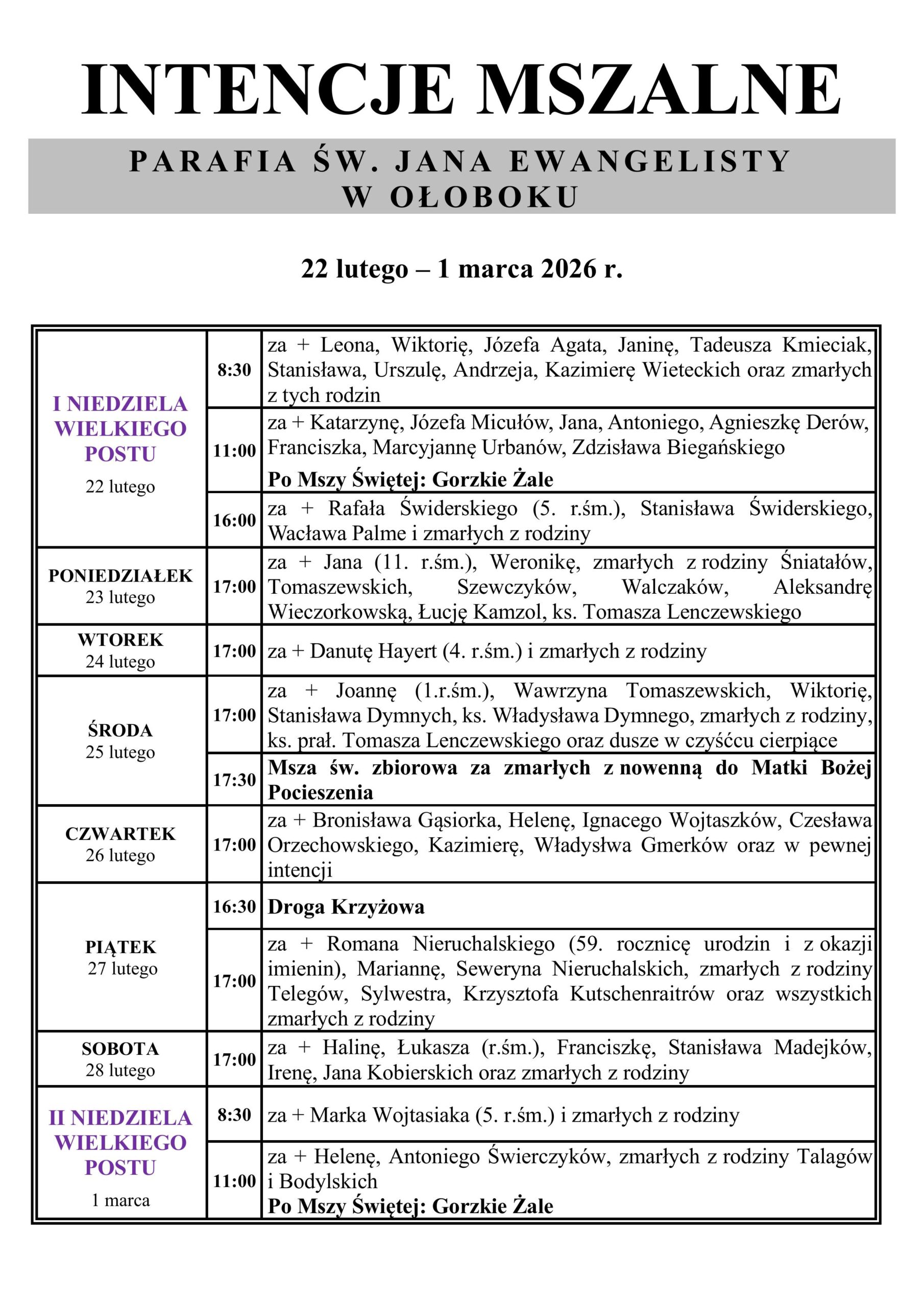 Intencje mszalne: 22 lutego – 1 marca 2026 r.
