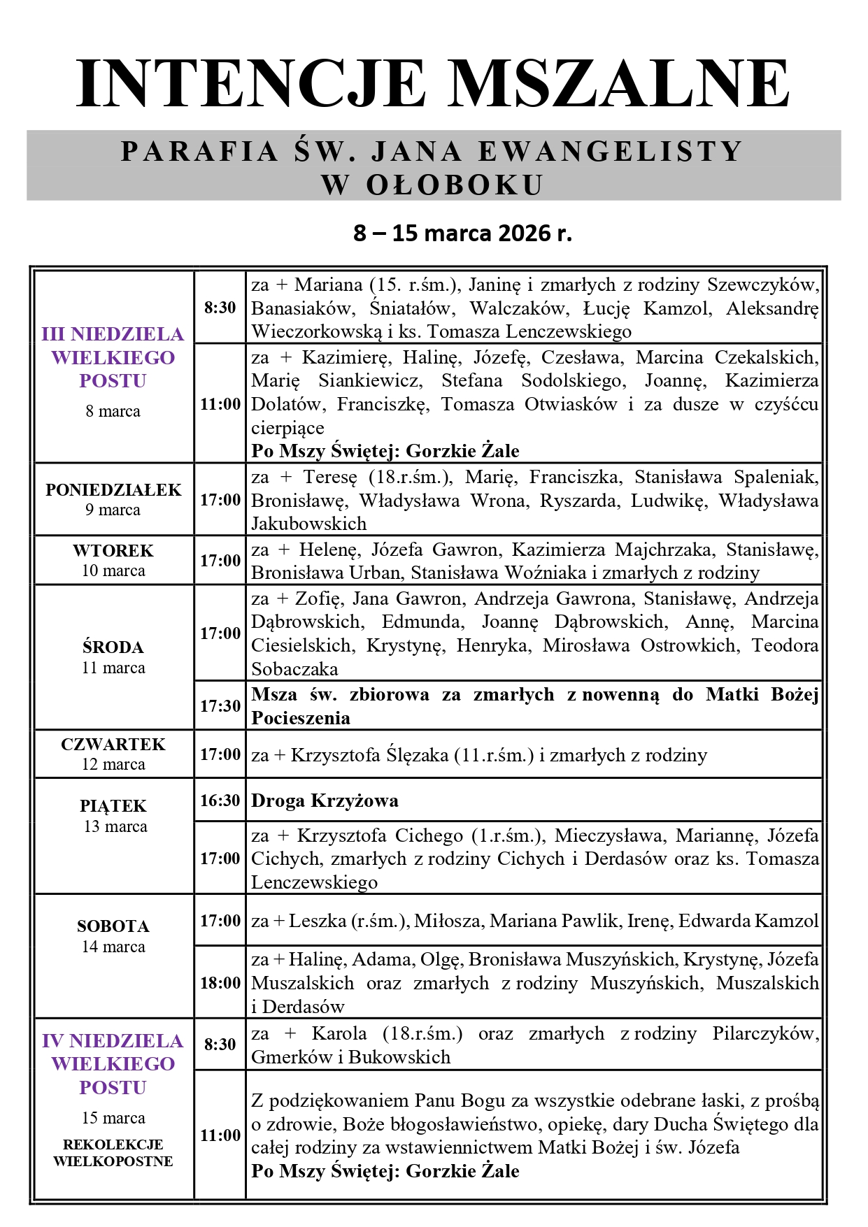 Intencje mszalne: 8-15 marca 2026 r.