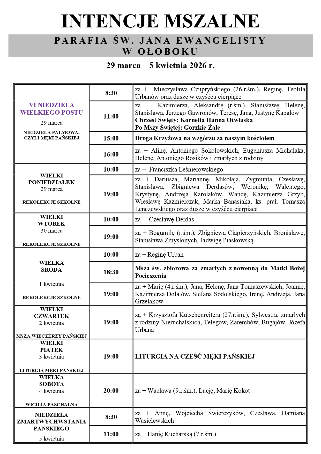 Intencje mszalne: 29 marca – 5 kwietnia 2026 r.